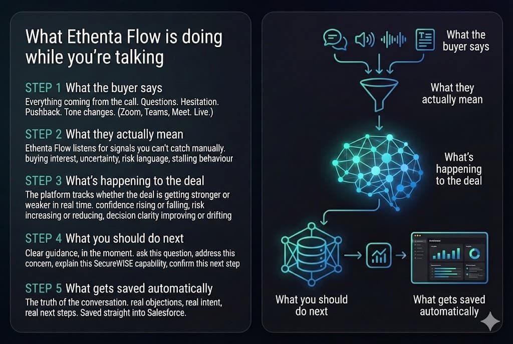 By the time the workshop begins, EthentaFlow has already extracted hundreds of insights, detected themes, scored confidence levels, and prepared a Discovery Intelligence briefing for the facilitator. The workshop starts with data, not blank whiteboards.